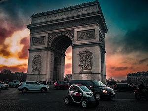 In the golden embrace of the setting sun, a dramatic scene unfolds at the Arc de Triomphe. The iconic monument stands tall, its majestic silhouette beautifully highlighted against the dusky sky. The fading sunlight casts a warm glow, accentuating the intricate details of the arch's grandeur.