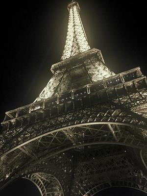 In this awe-inspiring photo, the Eiffel Tower reaches majestically towards the heavens, captivating viewers with its grandeur. Looking upward, the perspective emphasizes the tower's monumental height, evoking a sense of wonder and reverence.