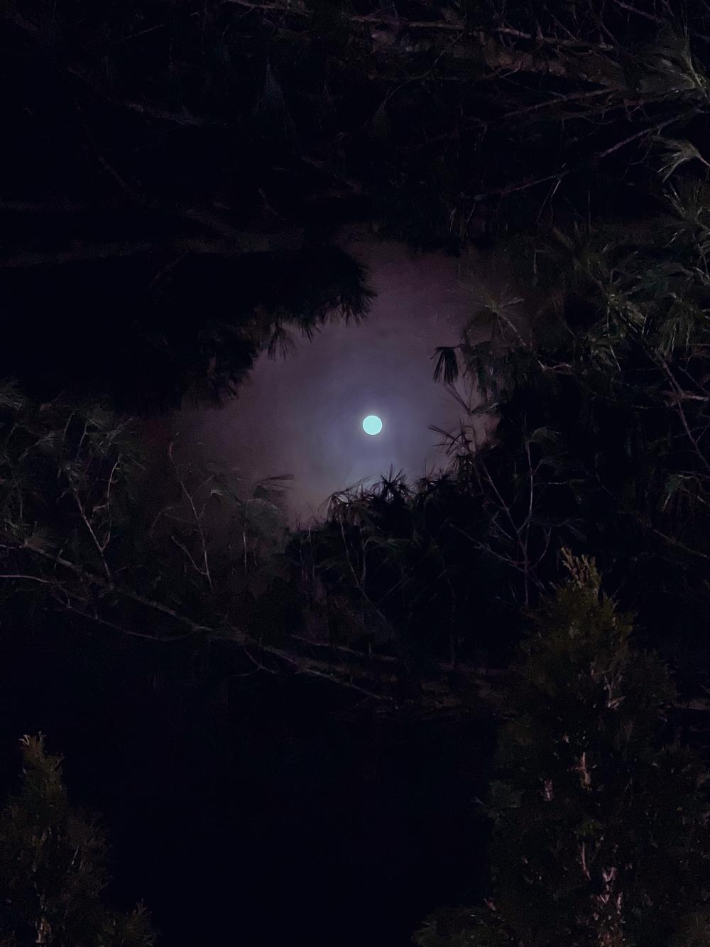 In the depths of the night, an eerie aura envelopes the scene as a full moon peers through the gnarled branches of ancient trees. The sky is an inky canvas, a backdrop that heightens the moon's radiant glow. Shadows dance and weave, accentuating the twisted contours of the trees, lending an otherworldly quality to the landscape. The moon's silvery light casts an ethereal glow upon the surroundings, revealing just enough detail to evoke a sense of mystery and enchantment. This hauntingly beautiful image captures a moment where the boundaries between reality and the supernatural seem to blur, inviting contemplation of the unknown.