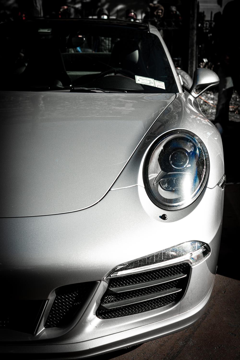 In the midst of a shadowy vignette, a sleek silver Porsche commands the spotlight with its arresting presence. Bathed in a soft, diffused light, the car's metallic exterior gleams like liquid silver, radiating an air of opulence and power.