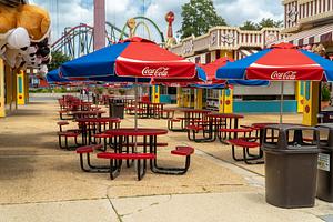 Amid the vibrant energy of an amusement park on a sun-soaked day, a lively scene unfolds beneath a sea of Coca-Cola umbrellas. The bold red and blue canopies create a striking contrast against the clear blue sky, casting playful patterns of shade on the ground below.