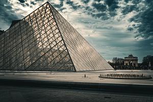 This photo presents a captivating and dramatic perspective of the Louvre’s glass pyramid under a brooding, cloudy sky. The intricate angles of the pyramid’s glass panels reflect the historic architecture behind it, seamlessly blending modern geometry with the museum’s classical essence. The moody tones enhance the atmosphere, evoking a sense of mystery and depth, making it a stunning visual representation of the Louvre’s architectural brilliance.