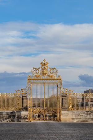 This image captures the magnificent golden gates of the Palace of Versailles, gleaming brilliantly under a radiant blue sky on a sunny day. The intricate craftsmanship of the gates, adorned with ornate scrollwork and royal emblems, reflects the grandeur and opulence synonymous with the French monarchy. The vibrant gold contrasts beautifully with the serene azure backdrop, creating a striking visual that exudes elegance and majesty. These gates, an enduring symbol of Versailles, invite viewers to imagine the splendor and history that lies beyond them.