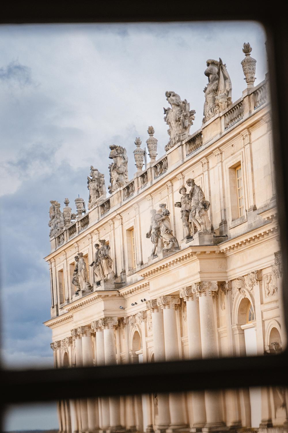 This stunning image captures the grandeur of the Palace of Versailles, an iconic symbol of French opulence and architectural mastery. Framed through a window, the photograph highlights the intricate sculptures adorning the palace’s rooftop, each figure a testament to the artistry of the Baroque era. The sunlit cream-colored stone facade reveals exquisite details in its columns and carvings, emphasizing the elegance and precision of its design. Set against a soft blue sky, this view of Versailles embodies the timeless beauty and historical significance of one of France’s most treasured landmarks.