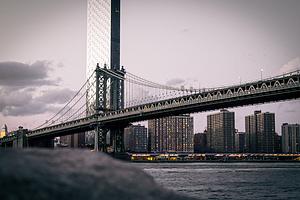 In this captivating photo, the Manhattan Bridge stands as a majestic architectural marvel, framed by a rugged rock in the foreground. The bridge's soaring towers reach for the sky, forming an iconic silhouette against the urban backdrop of New York City.