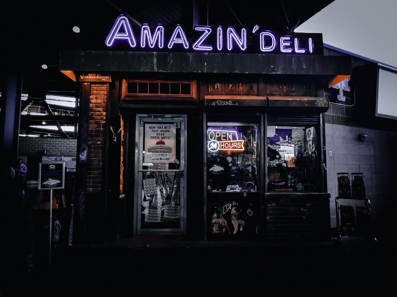 Stepping into the "Amazin Deli" pop-up store at Citi Field is like taking a nostalgic journey back to the vibrant streets of 1990s NYC. Embracing dark, moody colors, the store exudes a sense of urban charm that instantly transports visitors to a bygone era. The neon sign flickers with a warm glow, adding a touch of retro allure to the ambiance.