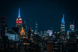 Captured against the backdrop of the night sky, the city skyline unfolds in a breathtaking display, with the iconic Empire State Building standing proudly at the center of the composition. The photograph is immersed in a sea of dark colors, predominantly deep blues that dominate the nocturnal atmosphere. Illuminated by the city lights, the Empire State Building radiates a patriotic glow, as the red, white, and blue lights pierce through the velvety darkness. The play of colors creates a striking contrast, casting a serene and majestic ambiance over the urban landscape. This captivating image captures the essence of the city's nocturnal allure, with the iconic landmark serving as a radiant beacon against the cool, blueish hues of the night skies.
