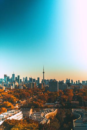 Amidst the colorful foliage, the Toronto skyline emerges, bathed in soft, warm sunlight. The iconic buildings rise gracefully against the backdrop of a clear azure sky, their mirrored surfaces reflecting the beauty of the season. As the city awakens, the twinkling lights start to emerge, adding a touch of magic to the evolving dusk.