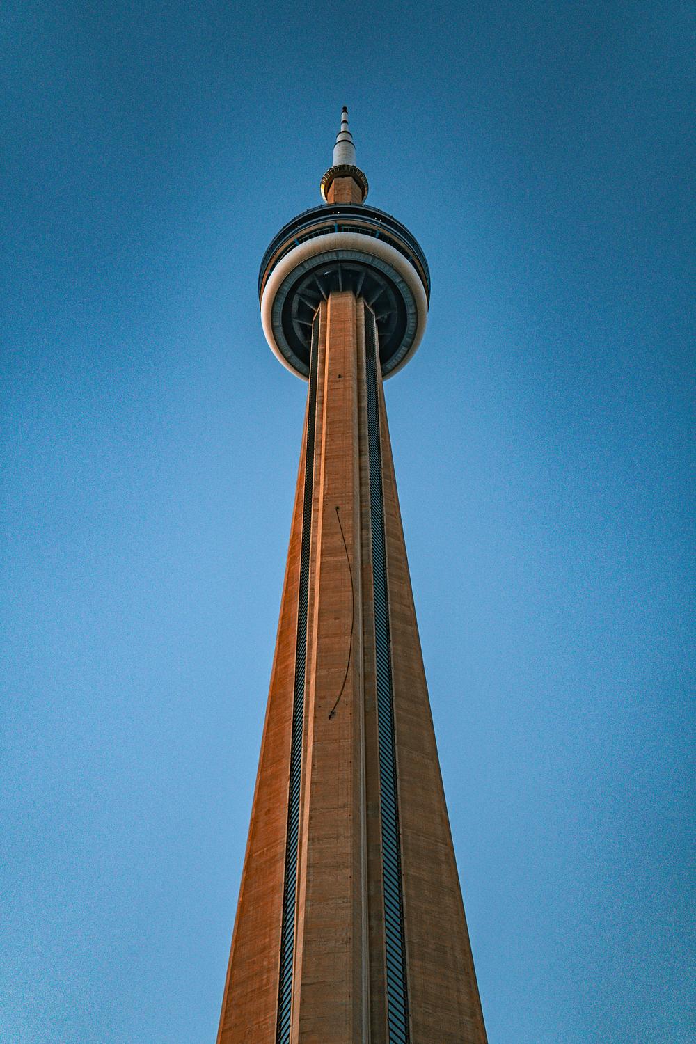 In this photo, the CN Tower commands attention as it stands tall and solitary against a clear blue sky. The tower's imposing presence is accentuated by the vastness of the unblemished sky that surrounds it. Bathed in natural sunlight, the tower's metallic surface reflects the brilliant blue hues, creating a striking contrast that highlights its iconic shape and structure.
