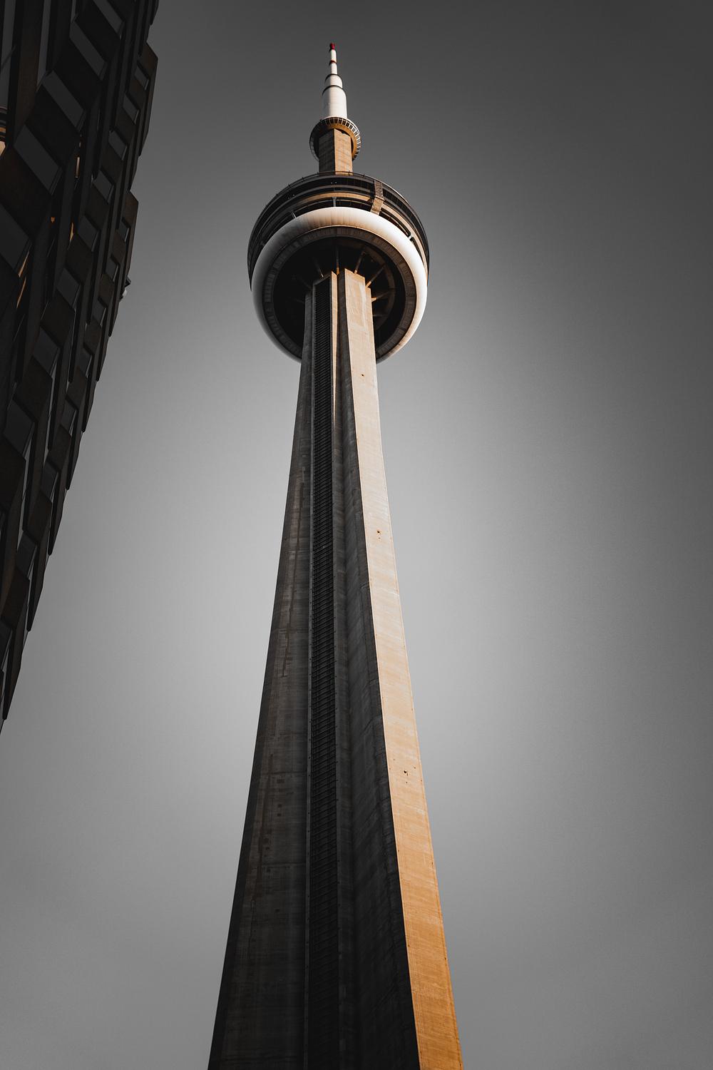 In this photo of the CN Tower, the atmosphere exudes a sense of tranquility and elegance. The tower stands tall, shrouded in a subtle monochromatic palette, with shades of grayscale dominating the scene. Soft and gentle lighting enhances the tower's contours, casting delicate shadows that add depth to the image. The simplicity of the monochromatic tones draws attention to the tower's architectural details, creating an artistic and timeless aesthetic. The overall effect is both captivating and serene, capturing the essence of the iconic structure in a subdued and sophisticated manner.