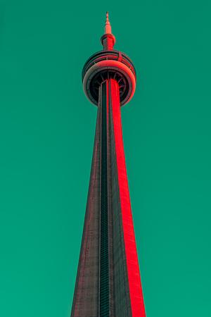 In this creative and imaginative photo, the CN Tower stands alone, transformed by a striking red and green hue that imbues the scene with an otherworldly charm. The vibrant colors envelop the iconic tower, creating an intriguing contrast to its usual appearance.